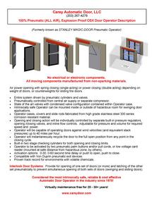 Carey automatic door llc manufactures magic door pneumatic door operators for hazardous swinging and sliding door applications formerly known as stanley magic door pneumatic operators.