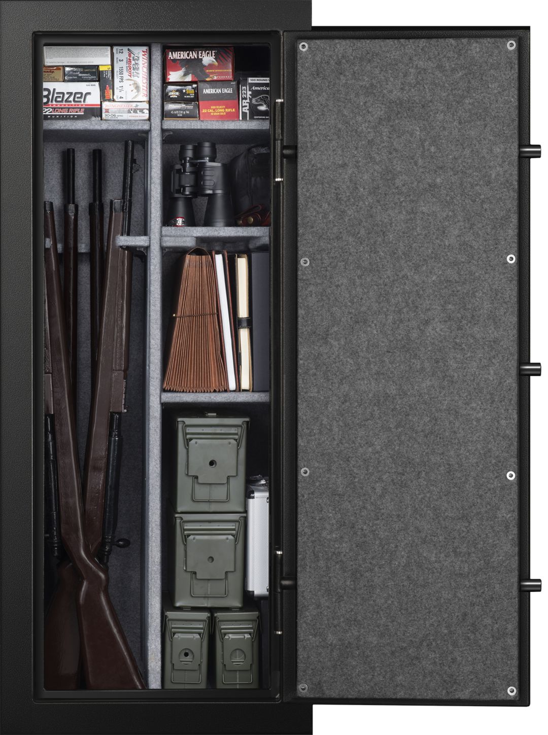 Able to store up to 24 rifles or shotguns along with 4 additional handguns the sportsman 24 gun fire safe is qai verified to 1400 degrees for up to 30 minutes and features a 3 number e lock with a customizable code.